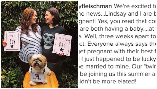 The couple took to Instagram to make their precious announcement. One’s holding up a sign saying, “It’s a boy” as the other’s sign says, “It’s also a boy.” And their dog has a sign that says, “Big sister.” The kicker – both are due this summer, just three weeks apart.
