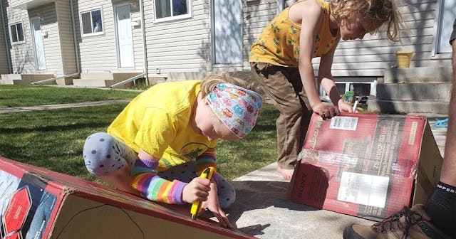 My mother raises her eyebrows at me with the kind of look that suggests I may be a dangerous or neglectful parent. I’m not. I swear. The fact is, Lily is good at box cutters. I have thrown this child at least two birthday parties where the theme was “build a cardboard box fort” and she and her little brother build things with boxes (and use box cutters) all the time. One of their favorite games is “recycling crafts” where they empty the recycling bin and turn the trash into their very own treasured creations.