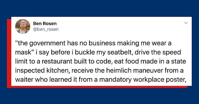 Of course, the great mind-bending irony of all these people getting their panties in a wad because the government is mandating that they wear masks is that if they had made the free choice to wear masks in the first place, mandates would not have been necessary.