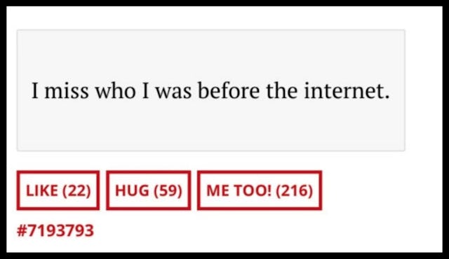 Okay, so before the internet, I may have been embarrassingly behind on the latest eyebrow trends, and my life was devoid of Kermit-sipping-tea memes, but I can’t help but miss the old, pre-social-media me. The honest me who didn’t sit straight-faced while I send the “cry-laughing” emoji. The unhurried me who had time to tell someone to GTFO without using acronyms. The ignorance-is-bliss me who didn’t have to grapple with the fact that Aunt Bertha “liked” a Facebook page for cougars seeking hot young studs. The perfectly adequate me who didn’t even have Pinterest boards, let alone see them as a collection of good intentions that will never see the light of day. My life was simpler in so many ways.