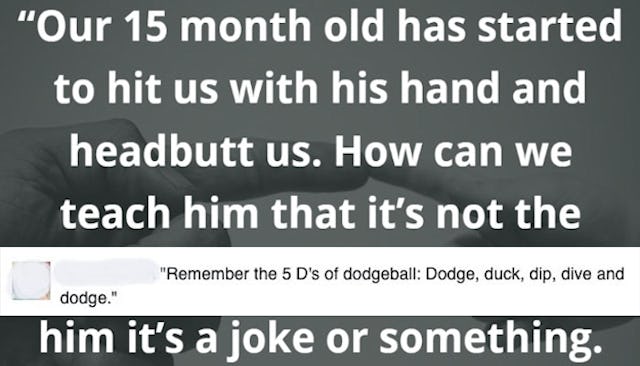 Sometimes when we’re in the throes of parenting, it makes us feel better to seek advice on everyday problems. You know, how do I introduce solid foods? What age should my kid be in a “big boy” bed? What do lice look like? (Answer: burn the house down.) But when a concerned parent asked for advice on his kid headbutting him, well, the answers were hilariously unhelpful.