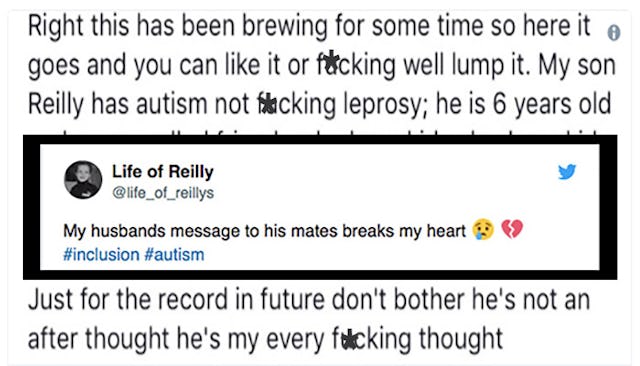 “My son Reilly has autism not fucking leprosy,” he wrote. “He is six years old and my so called friends who have kids also have kids’ parties. Not ONE invite not fucking one.” It’s a double gut punch. Not only does it hurt like hell to see your child get excluded, but it hurts as a friend to feel like you’re getting rejected as well. When you have kids around the same time as your friends, you think that if you’ve got to give up Saturday nights at the bar, at least you’re all in this together right? But the Stephensons’ friends bailed on their end of the deal, presumably just because Reilly’s autistic.