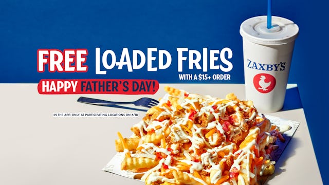 - Zaxby's: Use the Zaxby's app to order a meal for Dad on June 18, and you'll get a free order of Chicken Bacon Ranch Loaded Fries when you spend $15 or more.