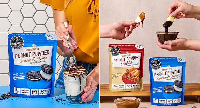 Flavored PB Co. creates peanut powders in a four-step process. First, peanuts sourced from farms are slow-roasted to bring out the nutty flavor. Next, they’re pressed to remove access oils and fats before, third, they’re ground into a fine powder. Finally, the powder is combined with flavorings that are free of artificial dyes and food colorings. At this point, all you have to do is add water to bring it back to a creamy consistency.