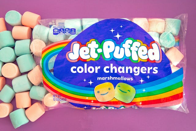 S'mores season is almost upon us, and Jet-Puffed just introduced a new product that's sure to entertain your little sugar monsters all summer long. The company that previously brought us pumpkin spice and peppermint-flavored marshmallows is kicking things up a notch with color-changing marshmallows. What witchcraft is this, you ask? The company hasn't revealed the science behind the color switcharoo, but it only takes 10 seconds of exposure to heat for the marshmallows to change shades.