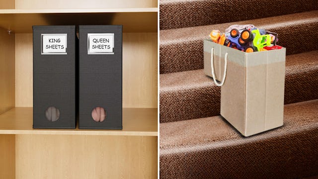 It’s no secret that sheets are nearly impossible to fold and store. That’s what makes these sheet organizers so amazing. “The space-saving design is genius, allowing your linens to be stored vertically on your shelf,” explains Courtney Cummings, the founder of The Stylish Organizer. Each organizer can hold an entire sheet set of any size. The peek-a-boo window in front allows you to quickly identify the contents inside.