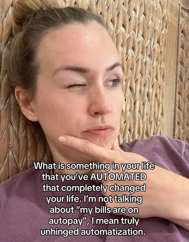 So, when social media personality Jen Hamilton (@_jen_hamilton_ ) asked for everyone’s most “unhinged automation” hacks, I was all ears. Hamilton was specific, too: She wanted unhinged ideas. Not just “my bills are on autopay,” she wrote as an overlay of the video, but automated ideas that completely changed someone’s life.