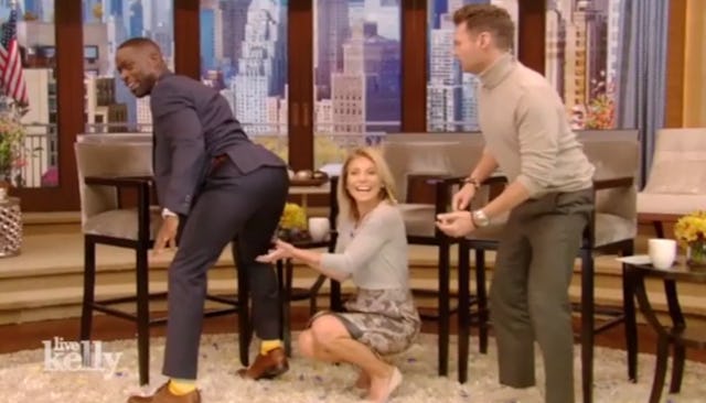 Sterling explains that by this point, his wife was on all fours and the baby’s head was out. Despite the dad’s panic, the mid-wife calmly instructs him to tell his wife to push, and sure enough, here comes the baby. Ever the helpful storyteller, Sterling hilariously demonstrates for Kelly, Ryan and the audience what it looked like when she assumed that position. Kelly very eagerly took on the role of dad catching the baby. Hilarity ensued. End scene. This is pretty much the funniest moment in morning television of all time ever.