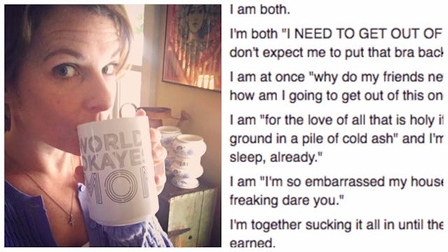Petrone’s post begins “I am both. I’m both ‘I NEED TO GET OUT OF HERE RIGHT THIS SECOND’ and ‘I hope you don’t expect me to put that bra back on and go anywhere.’ I am ‘for the love of all that is holy if one more person touches me I will fall to the ground in a pile of cold ash’ and I’m ‘someone get over here and snuggle me to sleep, already.'”