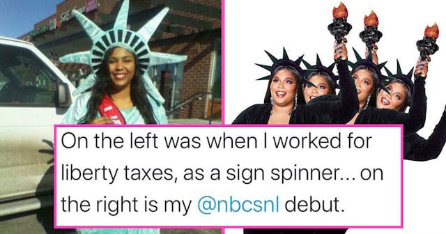 Ironically, Lizzo appears similarly clothed in both photos. When she was a sign spinner, she not surprisingly wore a Lady Liberty getup since it is the company’s unofficial mascot. In the SNL promo, she’s dressed as a chic modern version of Statue of Liberty rocking a sleek black dress and matching torch as opposed to the standard seafoam green. You can definitely file it under “full circle moment.”