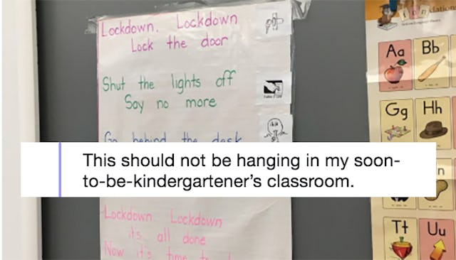 “This should not be hanging in my soon-to-be-kindergartener’s classroom,” Cohen wrote. And while this should never be a thought in a child, teacher, or parent’s minds, unfortunately it’s the reality we live in.