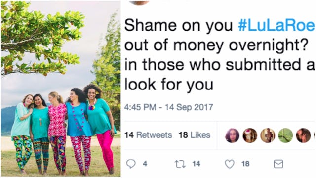 The final blow? LuLaRoe will no longer accept the return of seasonal merchandise or items that have been discontinued, a huge problem for those stuck with 200 pairs of Valentine’s Day or Christmas “duds” they were unable to move during those holiday seasons. Keep in mind, LuLaRoe consultants can’t order anything in specific patterns. They can request a certain number of one-size leggings or Sarahs or Irmas, but what they receive is total luck of the draw. So now, the company won’t even reimburse them for those dozens of weird shamrock leggings they weren’t able to sell.