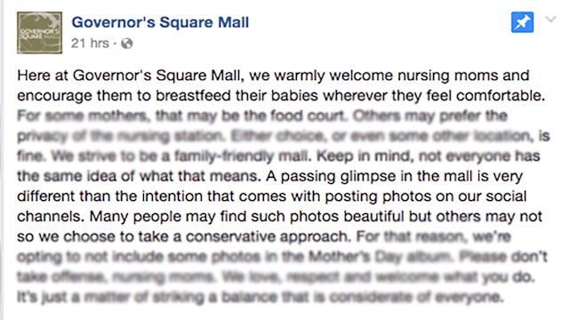 “Here at Governor’s Square Mall, we warmly welcome nursing moms and encourage them to breastfeed their babies wherever they feel comfortable,” the post starts. “For some mothers, that may be the food court. Others may prefer the privacy of the nursing station. Either choice, or even some other location, is fine.”