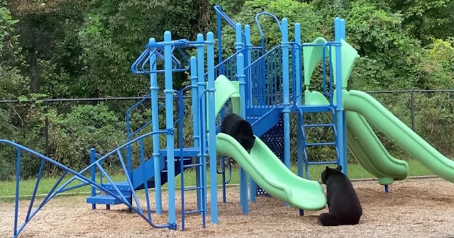 In a video captured by a fifth-grade teacher from Ashville, North Carolina, two bears are seen GOING DOWN THE SLIDE on the playground. At first, the mama bear goes down the big slide, so her cub follows after her, but appears to be too scared to go down the big slide. So mama runs around and parks herself at the bottom of the smaller slide as her little bear goes careening down it, landing safely in his mom’s arms.