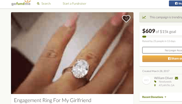 We’ve all heard the saying “Money can’t buy happiness” but one man is on a mission to have other people’s money to buy his. William Oliver set up a Go Fund Me page to help raise money for his soon-to-be fiancée’s $15,000 engagement ring. Yeah, you read that right. He wants total strangers to foot the bill for a piece of jewelry for another total stranger. And shockingly, no one is having it.