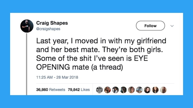 In an absolutely hilarious Twitter thread, Shapes lists all the things he’s learned about platonic female relationships — and women in general — from his unique living arrangement. While this is all news to him, every woman who reads this thread is laughing and rolling her eyes a little at his naivety.
