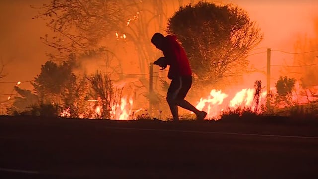 According to CNN, more than 100,000 acres have burned so far in the current fires, and a video taken on a stretch of Ventura County highway shows just what a hellscape the area is right now, with flames raging right up to the sides of the road. The video also shows a man in shorts and a hoodie running toward the flames instead of away from them.