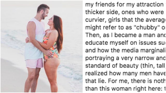 “Then, as I became a man and started to educate myself on issues such as feminism and how the media marginalizes women by portraying a very narrow and very specific standard of beauty (thin, tall, lean) I realized how many men have bought into that lie,” he writes. “For me, there is nothing sexier than this woman right here: thick thighs, big booty, cute little side roll, etc. Her shape and size won’t be the one featured on the cover of Cosmopolitan but it’s the one featured in my life and in my heart.”