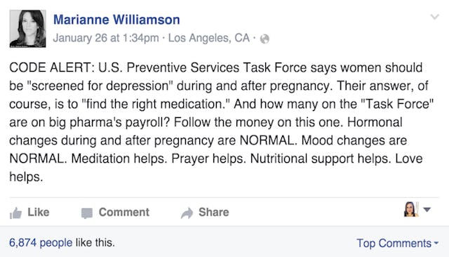 No, seriously. Williamson took to Facebook on Tuesday to denounce the recommendation, writing, “CODE ALERT: U.S. Preventive Services Task Force says women should be ‘screened for depression’ during and after pregnancy. Their answer, of course, is to ‘find the right medication.’ And how many on the ‘Task Force’ are on big pharma’s payroll? Follow the money on this one. Hormonal changes during and after pregnancy are NORMAL. Mood changes are NORMAL. Meditation helps. Prayer helps. Nutritional support helps. Love helps.”
