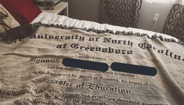 Francis-Vaughn’s mom had her education master’s degree printed onto a cozy throw blanket, and I need one for my journalism degree ASAP. I’m also envisioning all the other types of documents that would also make great blankets, like a divorce finalization or a bangin’ job offer. So many possibilities.