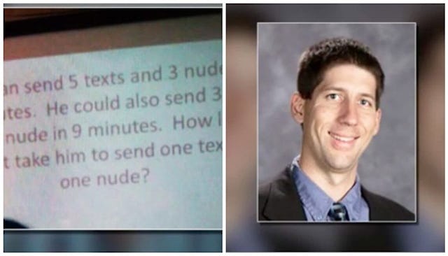 The problem reads:”Tony can send 5 texts and 3 nudes in 19 minutes. He could also send 3 texts and 1 nude in 9 minutes. How long would it take him to send one text and one nude?” The math problem was put up on the overhead projector as part of that day’s lesson.