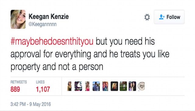 Yesterday on Twitter, writer Zahira Kelly started the hashtag #MaybeHeDoesntHitYou with a series of tweets listing hypothetical scenarios indicative of verbal and emotional abuse. “Maybe he doesn’t hit you,” reads one, “He just complains about your belly after you had his kids.”