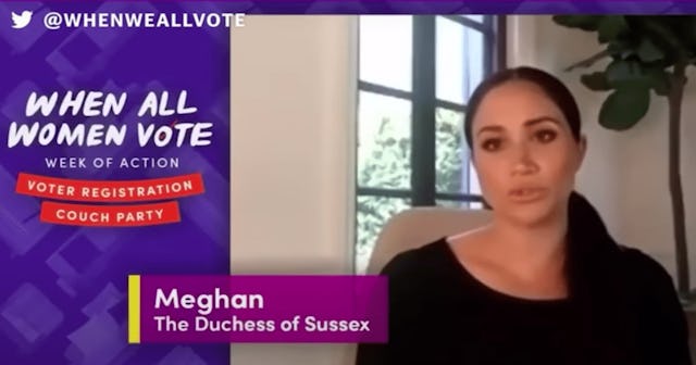 While it’s not typical for royals to speak publicly on matters of politics, voting itself is partisan. And if anyone knows the power of using your platform, it’s just-moved-back-to-California-and-ready-to-get-to-work Meghan Markle. She began by talking about what it means to vote in the upcoming election, remembering the 100th anniversary of the 19th amendment, voter suppression and the importance of being an active voter.
