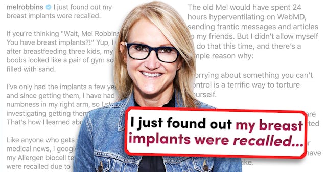 During a typical weekend Instagram scroll, I came across someone who mentioned a woman named Mel Robbins and her powerful video regarding breast implants. As someone who has implants myself, set to have them removed in a few weeks, I immediately searched Mel’s name and found her video. She describes how she just found out that the type of breast implants she has can be linked to a rare form of lymphoma. She goes on to share that she’s not playing around. Her implants are coming out — ASAP.