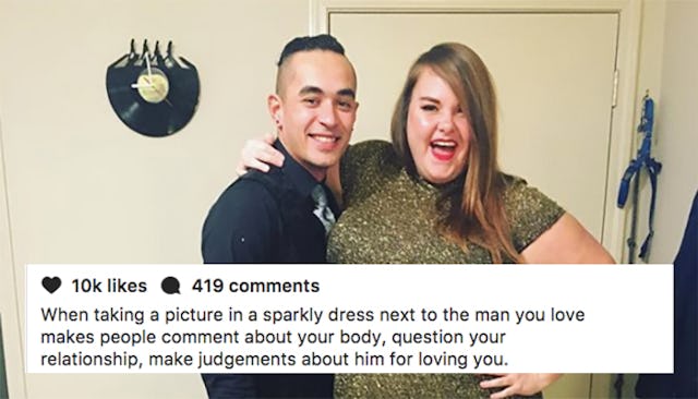 There is never a justifiable reason for body-shaming anyone, ever, but that doesn’t stop Instagram trolls from doing what they do. When body positive activist Melissa Gibson shared a photo of her with her boyfriend on New Year’s Eve, strangers on the internet (everyone’s favorite group of party-poopers) decided to tell her she didn’t “deserve” him — because he’s thin.