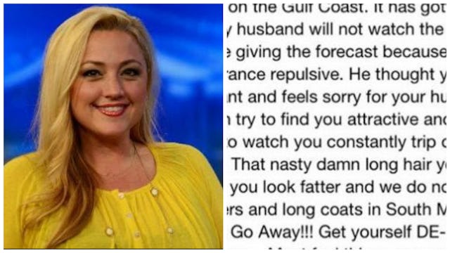Meteorologist and new mom Carrie Duncan of WLOX in southern Mississippi recently took to her Facebook page to share a delightful email from a deranged and abusive viewer. If you’re looking for a little enlightenment on what goes on inside the brain of a truly awful human being, look no further than the inane yet impeccably mean email Duncan received.