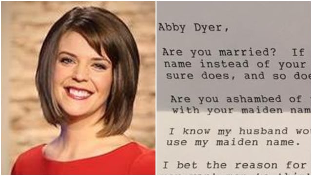 The viewer sent Abby Dyer, a meteorologist for an NBC affiliate in Missouri, an anonymous letter about the matter. “Abby Dyer,” the letter begins. “Are you married? If so, why don’t you use your married name instead of your maiden name?” The letter also mentions two other co-workers of Dyers who are married and use their married name on air.