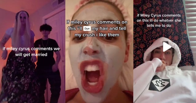 TikTok is awesome, but also like, super weird right? We can all agree that a dog named Bunny who talks and teenagers who are millioniares for dancing on TikTok is odd, but the newest wild TikTok trend is that people are daring themselves (?) to do silly stuff and make major life decisions — like whether or not to get married — if, and only if, Miley Cyrus responds on their video.