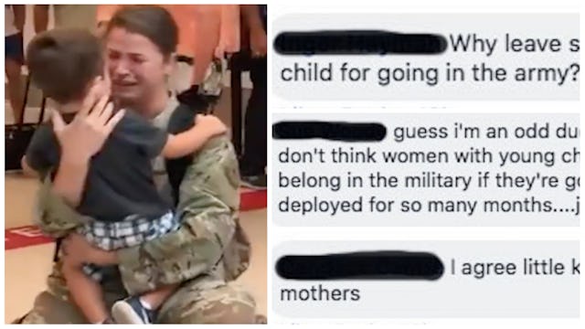 The limited, sexist perspective shown by comments like these shows just how obvious the double standard is with women and mothers who serve our country vs. the men and fathers who do. When fathers are deployed and come home and surprise their kids, the videos go viral and everyone shares their support and emotions in the comments section. A mother, doing the exact same job, is shamed for leaving her child.