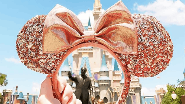 Disney just released new rose gold Minnie ears — and they’re pretty fantastic. Picture your usual adorable set of Minnie ears, but covered in rose gold sequins — complete with a rose gold shimmer bow.