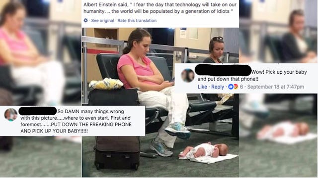 In the photo, we see Lensing sitting in a crappy airport chair on her phone while her infant daughter is sprawled out on a blanket on the floor near her feet. Some guy (because of course it was a guy — most fellow moms would never) shared the photo of her on his Facebook page to shame her and refer to her as an “idiot” for being on her phone while her baby was on the blanket.