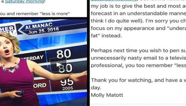 Meteorologist Molly Matott received an email criticizing her body, clothes, jewelry