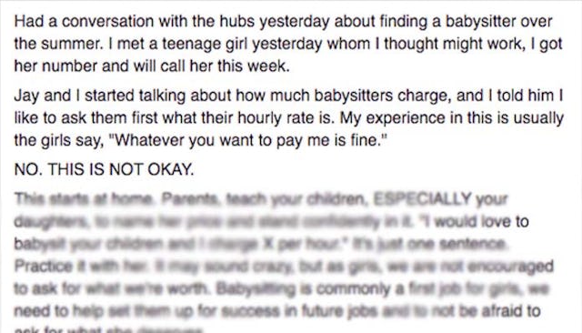 North Carolina mom Andrea Owen recently wrote on Facebook that she’s seeking a babysitter over the summer and started talking with her husband about one of her biggest pet peeves: the salary discussion. “Jay and I started talking about how much babysitters charge, and I told him I like to ask them first what their hourly rate is,” she said. “My experience in this is usually the girls say, ‘Whatever you want to pay me is fine.’ NO. THIS IS NOT OKAY.”