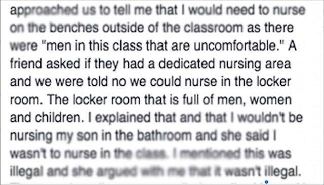 “I sat on the balance beam against the wall,” she wrote in the post. “To my right are big storage shelves of toys and balls. I nursed my son. As we were finishing up two upper level management entered the room and approached us to tell me that I would need to nurse on the benches outside of the classroom as there were ‘men in this class that are uncomfortable.'”