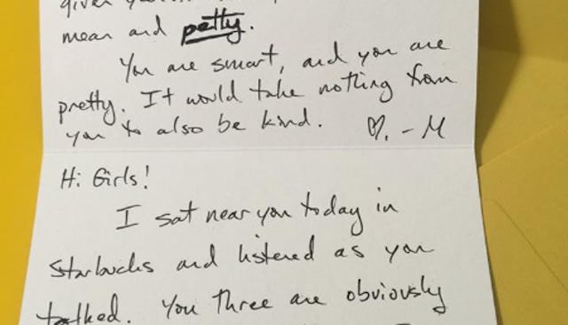 One commenter suggested after reading her account that she do something about it. In a post shortly after, she writes, “I left and went to do my grocery shopping, conflicted the whole time, and I could see the girls still sitting in Starbucks as I drove home. I ran into my house, grabbed a note card and wrote a quick, heartfelt note.”