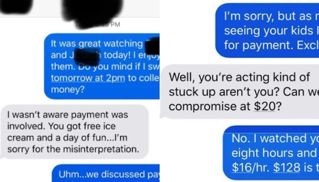 Reddit user VortexThing shared an infuriating string of texts between their sister and a woman the sister did some babysitting for. After doing her job (that should equal actual dollars in her pocket, nothing less) she texted the mom asking for payment. And this happened.