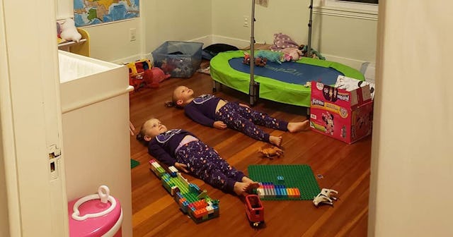 In the picture Jessica shared, the two girls, Hannelore, 3, and Emma, 4, are lying side-by-side on a hardwood floor, adorably staring up at the ceiling. You can tell they are really intent on making sure their pajamas are well-fueled for the whole night. LOL for days. Jessica posted about the event on Facebook just a few days ago and it’s already racked up over 100k shares. Clearly, people are enthralled with her creative (and downright hilarious) solution.
