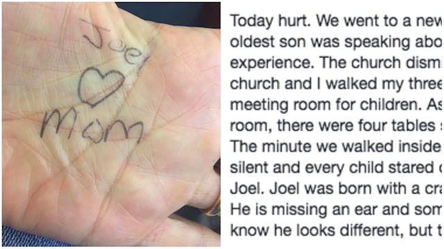 “Today hurt,” Stacey Gagnon, a nurse living in Arizona and mother to six children, four of whom are adopted with special needs, writes in an emotional Facebook post. She explains that she brought her 9-year-old son Joel to a new church over the weekend and as they entered the kid room, a hush fell over the room with stares and pointing.