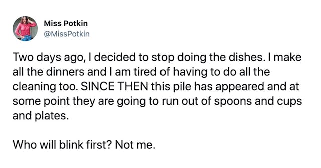 It all started when a mom on Twitter (@MissPotkin) shared a photo of her messy kitchen. With dishes piling up in and on the sink, her family was clearly oblivious to the mess, so she decided she would stop cleaning until someone else in her household took notice and actually cleaned up the damn house. The saga began on March 15 and her family didn’t get their sh*t together until **checks notes** March 18!