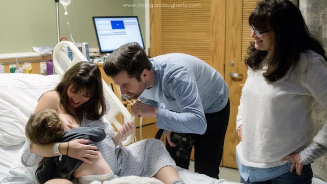 Birth photographer Maegan Dougherty documented a beautiful moment between a laboring mom and her toddler. The photo shows wedding photographer and newly-minted mom of two Kate Neal weathering contractions while also tending to her two-year-old — by breastfeeding her. The little one had stopped in to visit her mom and decided she wanted to nurse.