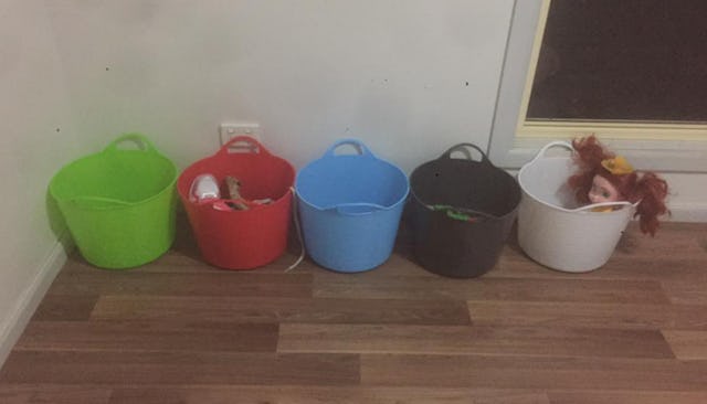 McGinty tells Scary Mommy the buckets have been a total game-changer at her house. “We’re a blended family of five, nine and under – nine, seven, seven, six, and two. It’s working well so far. I can wander around and pick up any missed things and drop them in the buckets and the kids love them, knowing exactly where things they’ve missed are,” she says.