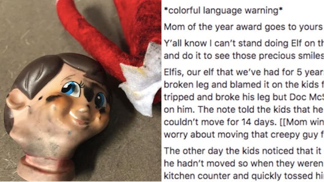 “Sooooo…. guess what I’m doing today?” she writes. “I’m having to scramble and find the other elf we have and then I have to call Santa (in front of the kids) and ask him if he will please pick Elfis up tonight. Ya know, since he is unable to make it to the North Pole to get fixed because his head literally popped off from being too hot once we pulled him out of the oven and his feet are completely melted off.”