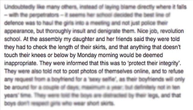 Manning was appropriately furious and let the school know it. She hit the nail on the head when describing what the problem really was in this situation: “The problem is not with the girls and the length of their skirts, nor whether or not they choose to share photos with their boyfriends or anyone else. It’s with the boys themselves; their sense of entitlement and sexist attitudes towards women and girls, their lack of respect, and the trust they CHOOSE to break.”