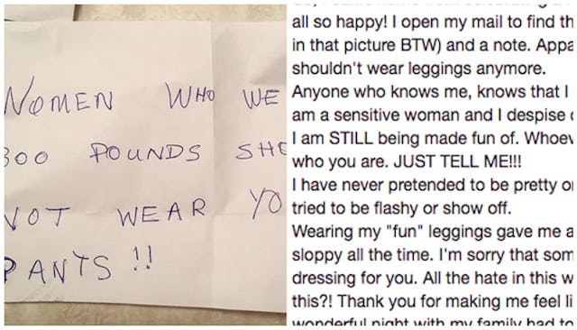 In her post that night, Markland wrote, “I have never pretended to be pretty or look good in clothing, I have never tried to be flashy or show off. Wearing my ‘fun’ leggings gave me a tad bit of confidence in not looking sloppy all the time.” That’s heartbreaking to read because it’s clear that people like the abyss of rotting phlegm who sent her that letter have made her feel like she has no right to feel pretty or show herself off. And just as she was starting to put herself out there…BAM. Some piece of asshole fungus comes to try to ruin her day.