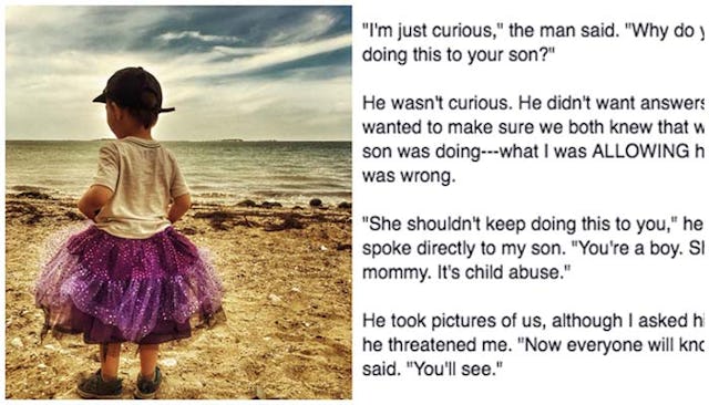 In a viral Facebook post , mom Jen Shattuck tells of an uncomfortable and dangerous situation in which a stranger approached her and her son, demanding to know why he was wearing a skirt. The stranger asked questions about why she was “doing this” to her son and told her son that she was a “bad mommy.” The bully took pictures of them and threatened them.