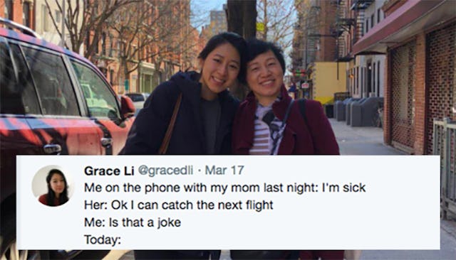 In her tweet, which includes a photo of Li and her mom together, she explains that she told her mom she felt sick and that turned into an immediate offer to come visit. “Is that a joke?” she asked.